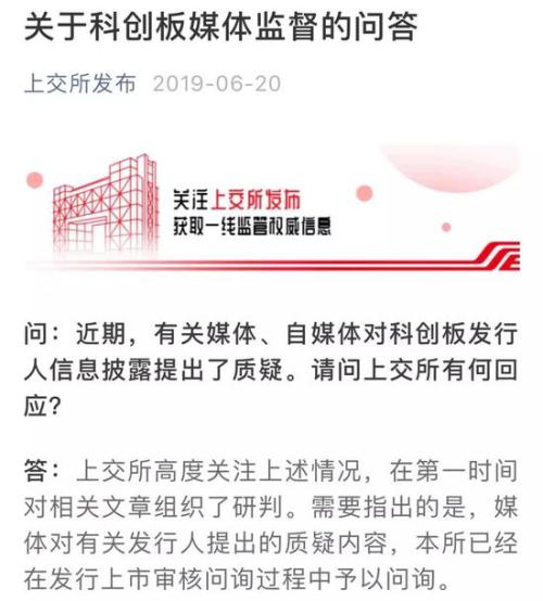 上交所表示高度关注自媒体、媒体质疑稿件情况,在第一时间对相关文章组织了研判。需要指出的是,媒体对有关发行人提出的质疑内容,上交所已经在发行上市审核问询过程中予以问询。