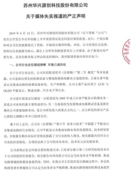针对质疑稿件,华兴源创发布了《关于媒体失实报道的严正声明》,声明指出近日个别自媒体对公司信息披露提出了质疑,并被部分媒体转载。对此,公司欢迎社会监督,坚持以信息披露为核心,满足上交所科创板股票发行上市要求。由于报道内容严重失实,且存在断章取义哗众取宠的倾向,现对报道质疑内容回应如下: