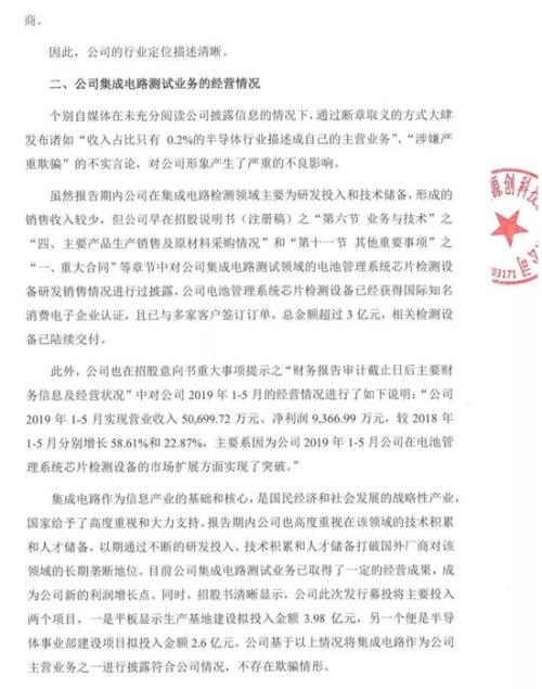 华兴源创表示,集成电路作为信息产业的基础和核心,是国民经济和社会发展的战略性产业,国家给予了高度重视和大力支持。报告期内公司也高度重视在该领域的技术积累和人才储备,以期通过不断的研发投入、技术积累和人才储备打破国外厂商对该领域的长期垄断地位。目前公司集成电路测试业务已取得了一定的经营成果,成为公司新的利润增长点。同时,招股书清晰显示,公司此次发行募投将主要投入两个项目,一是平板显示生产基地建设拟投入金额3.98亿元,另一个便是半导体事业部建设项目拟投入金额2.6亿元。公司基于以上情况将集成电路作为公司主营业务之一进行披露符合公司情况,不存在欺骗情形。