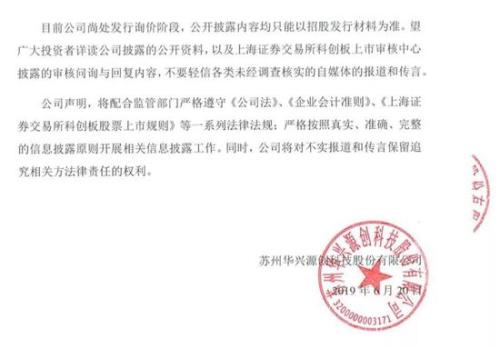 华兴源创强调,目前公司尚处发行询价阶段,公开披露内容均只能以招股发行材料为准。望投资者详读公司披露的公开资料,以及上海证券交易所科创板上市审核中心披露的审核问询与回复内容,不要轻信各类未经调查核实的自媒体的报道和传言。公司声明,将配合监管部门严格遵守《公司法》、《企业会计准则》、《上海证券交易所科创板股票上市规则》等一系列法律法规:严格按照真实、准确、完整的信息披露原则开展相关信息披露工作。同时,公司将对不实报道和传言保留追究相关方法律责任的权利。