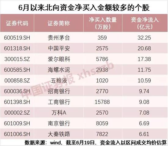 从具体增持对象看,以龙头白马为代表的核心资产依旧是北向资金的主攻方向。Wind数据显示,六月以来,北向资金对贵州茅台、中国平安、爱尔眼科(300015,诊股)、海螺水泥(600585,诊股)、五粮液(000858,诊股)等个股的净买入金额均超过10亿元。