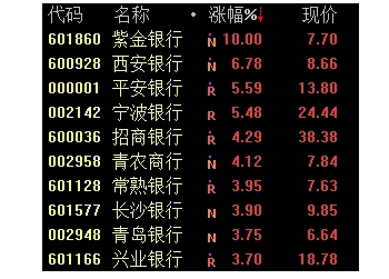 银行板块涨幅榜