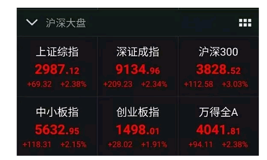 截至收盘,沪指涨2.38%,报2987.12点;深成指涨2.34%,报9134.96点;创业板指涨1.91%,报1498.01点。两市呈现量价齐升,成交额合计6030亿元。
