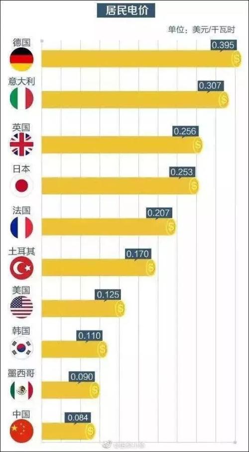 在@国资小新的配图中,中国的居民电价为0.084美元/千瓦时,和美国、日本、德国、英国、法国、意大利等主要发达国家相比,中国居民电价水平最低。