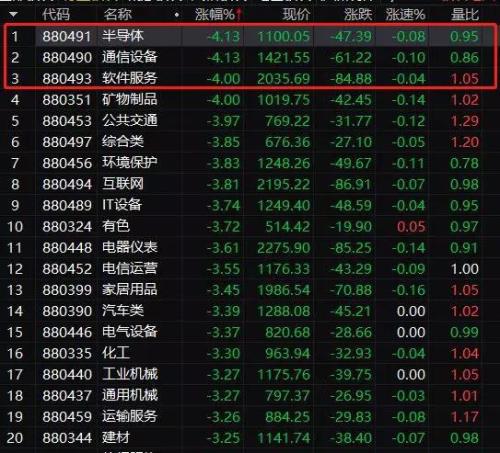 分板块来看,半导体、通信设备、软件服务等科技板块跌幅居前,农林牧渔为唯一逆势飘红行业。
