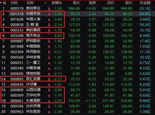 抱团白马股大跌。中国平安(601318,诊股)、五粮液(000858,诊股)、海天味业(603288,诊股)、双汇发展(000895,诊股)等都跌幅超2%。