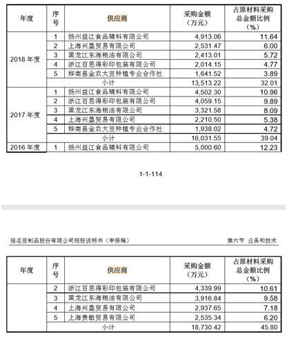 根据招股书,2016年祖名股份的前五大供应商依次分别为扬州益江食品辅料有限公司、浙江百思得彩印包装有限公司、黑龙江东海粮油有限公司、上海兴垦贸易有限公司、上海贵敏贸易有限公司,对应的采购金额分别为5,000.60万元、4,339.99万元、3,916.84万元、2,937.65万元和2,535.34万元。