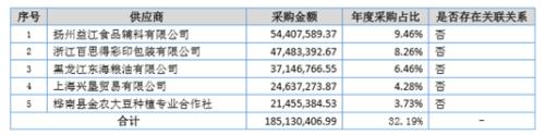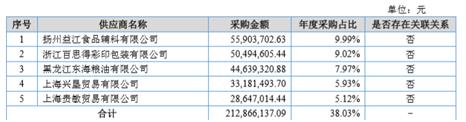 2017 年,上述前五大供应商扬州益江食品辅料有限公司、浙江百思得彩印包装有限公司、黑龙江东海粮油有限公司、上海兴垦贸易有限公司、上海贵敏贸易有限公司对应的采购金额分别为4,502.30万元、4,059.15万元、3,321.58万元、2,210.50万元和1,938.02万元。