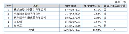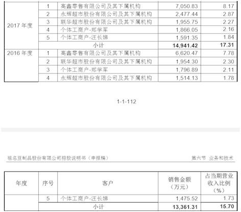 根据招股书,2016年祖名股份的前五大客户依次分别为高鑫零售有限公司及其下属机构、联华超市股份有限公司及其下属机构、个体工商户-郑学军、永辉超市(601933,诊股)股份有限公司及其下属机构、个体工商户-汪长娣,对应的销售金额分别为6,620.47万元、1,954.30万元、1,796.89万元、1,514.13万元和1,475.52万元。