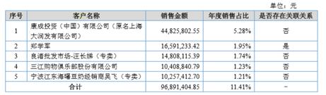 而其挂牌新三板披露的年报显示,2017年前五大客户对应的销售金额分别为5787万元,2176万元、1882万元、1586万元、1527万元,明显高于招股书数据。
