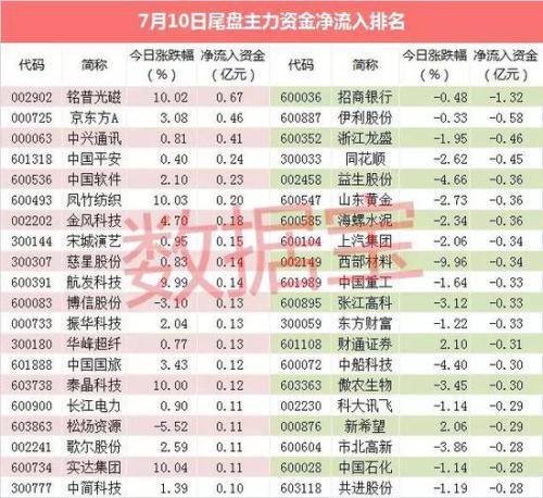 从尾盘资金流向来看,今日两市尾盘主力资金合计净流出40.63亿元,净流出规模为近18个交易日以来新高。单只股票来看,仅5只个股尾盘主力资金净流入超0.2亿元。铭普光磁尾盘主力资金净流入0.67亿元,净流入规模居首,该股今日尾盘涨停。京东方A(000725,诊股)、中兴通讯(000063,诊股)紧随其后,全天净流入资金分别为0.46亿元、0.41亿元,这两只个股今日分别上涨3.08%、0.81%。中国平安(601318,诊股)、中国软件(600536,诊股)尾盘主力资金净流入也在0.2亿元以上,尾盘净流入资金较多的还有凤竹纺织(600493,诊股)、金风科技(002202,诊股)、宋城演艺(300144,诊股)、慈星股份(300307,诊股)、航发科技(600391,诊股)等。