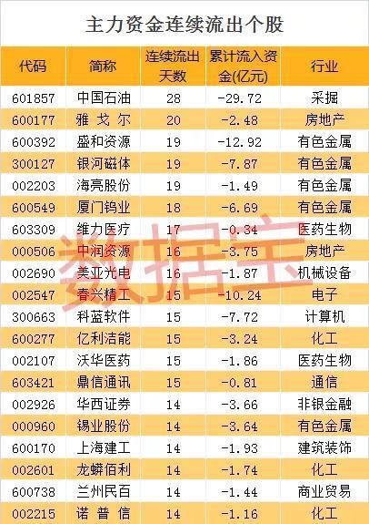 数据宝统计显示,截至7月10日收盘,主力资金连续流出个股中,连续流出天数最多的是中国石油,该股已连续28个交易日净流出;连续净流出天数较多的还有雅戈尔(600177,诊股)、银河磁体(300127,诊股)等,主力资金分别连续流出20天、19天。从连续流出期间资金净流出金额来看,主力资金净流出金额最多的是中国石油,资金累计净流出29.72亿元,主力资金净流出资金居前的还有新城控股(601155,诊股)、中科曙光(603019,诊股)、中钢天源(002057,诊股)等。