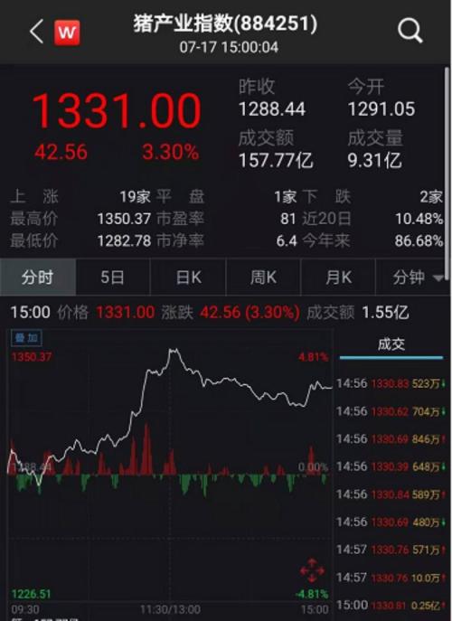 午后猪产业指数的风头被后来居上的光刻胶指数取代,指数有所回落,截止收盘,猪产业指数上涨3.3%,20只成分股中19只上涨,1只下跌。