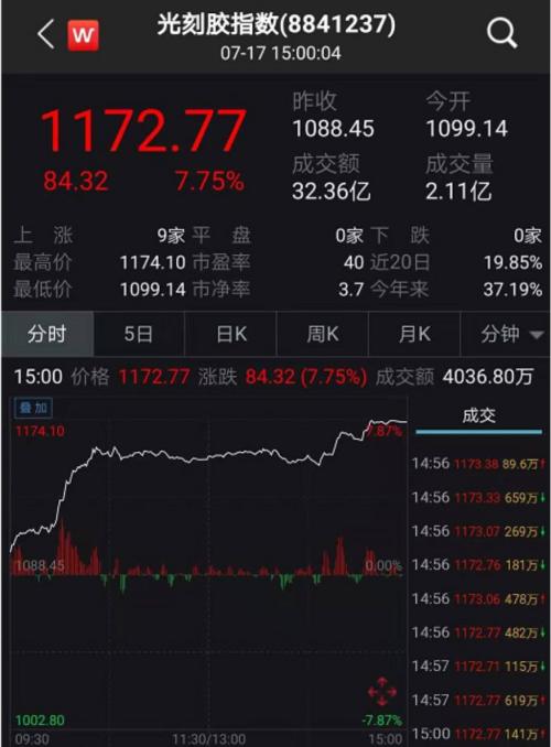 17日市场上最闪耀的明星就是光刻胶指数,截止收盘,光刻胶指数上涨7.75%。近五个交易日以来,光刻胶指数已经上涨了11.15%。