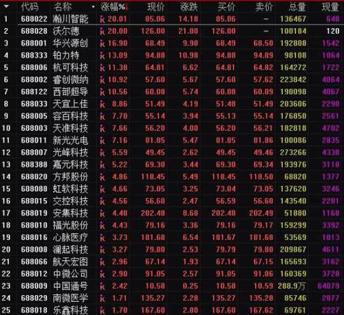 今日,科创板个股再次集体大涨,25只科创板个股全线飘红,全日成交290.82亿元,成为仅次于首日的第2大成交量,平均换手率42.34%。沃尔德(688028,诊股)、瀚川智能(688022,诊股)涨停,其中沃尔德8个交易日上涨125%。