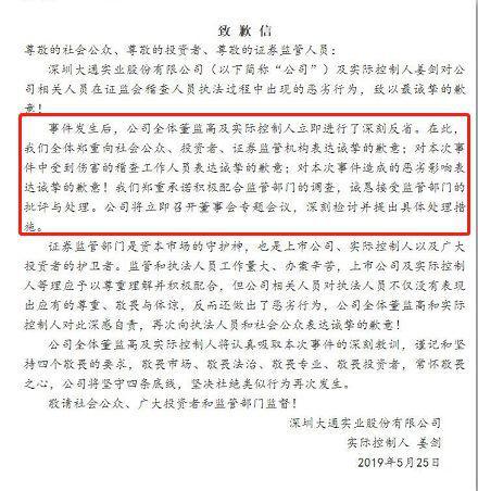 2019年5月22日下午,深大通员工使用推搡、抓挠调查人员,抢夺、摔砸执法记录仪等暴力方法抗拒调查,致证监会调查人员软组织损伤、手臂被抓伤、执法记录仪部分零件损毁。