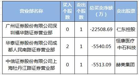 净卖出额位居前三的营业部为广州证券深圳福华路营业部、华泰证券成都人民南路营业部、中信证券上海牡丹江路营业部,涉及恒康医疗等热门股,净卖出额分别为2.25亿元、5540万元、5513万元。