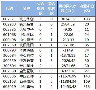 其中,北方华创、新兴装备获机构净买入,净买入5659万元;中国软件、石基信息、中科曙光等5股遭机构净卖出,合计净卖出4.89亿元。