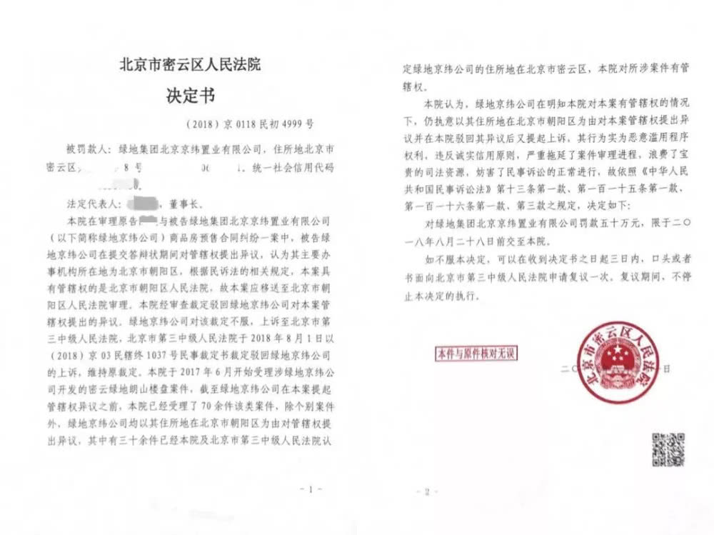 9月1日,北京市密云区人民法院就曾披露,2017年6月以来法院已经受理了绿地集团旗下北京京纬置业有限公司70余件诉讼案件。然而,后者在明知密云法院对相关案件具有管辖权的情况下,仍执意提起管辖权异议,该行为违反诚信原则,浪费了司法资源。因此对其罚款50万元。