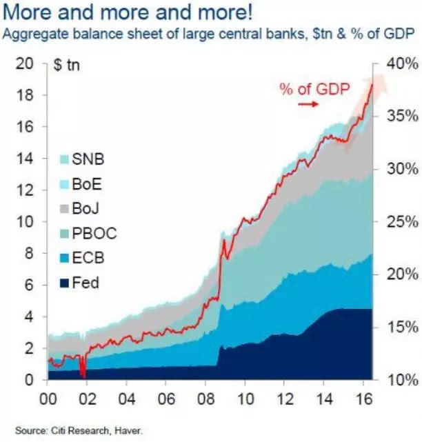 2008年金融危机之后,全球各大央行资产负债表规模急速扩张。全球经济在流动性异常充裕的背景下复苏,因此也十分脆弱。时至今日,欧央行和日本央行还在继续购买资产,保持低利率。