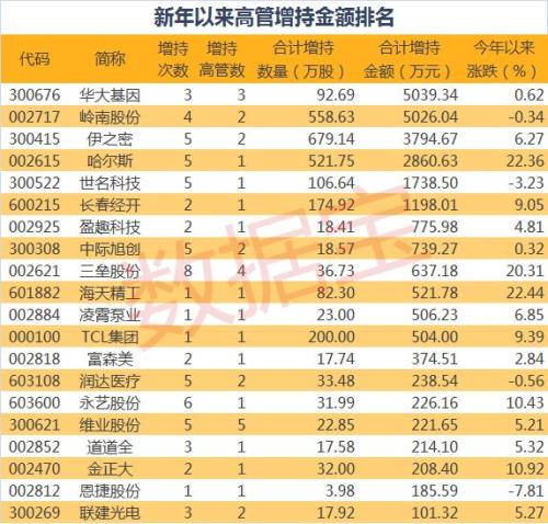 新年以来沪指创新低后震荡反弹,期间38家公司股份获高管增持,累计增持金额2.55亿元。其中,6家公司股份获大手笔增持,高管增持额均在千万元以上。根据深沪交易