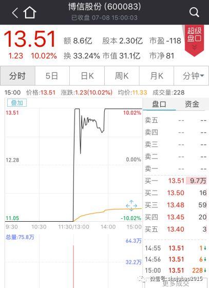 又一黑天鹅事件发生,又一家上市公司爆雷。博信股份(行情600083,诊股)早盘一字跌停,午后开盘巨量资金买入,3分钟之内股价由跌停拉升至涨停板。分时成交量来