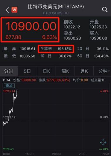 刚刚!比特币破万了! 截至记者发稿,比特币价格为10900美元,涨幅6.63%。这是2018年3月以来比特币第一次重回1万美金以上,也是13个月来的高点。至