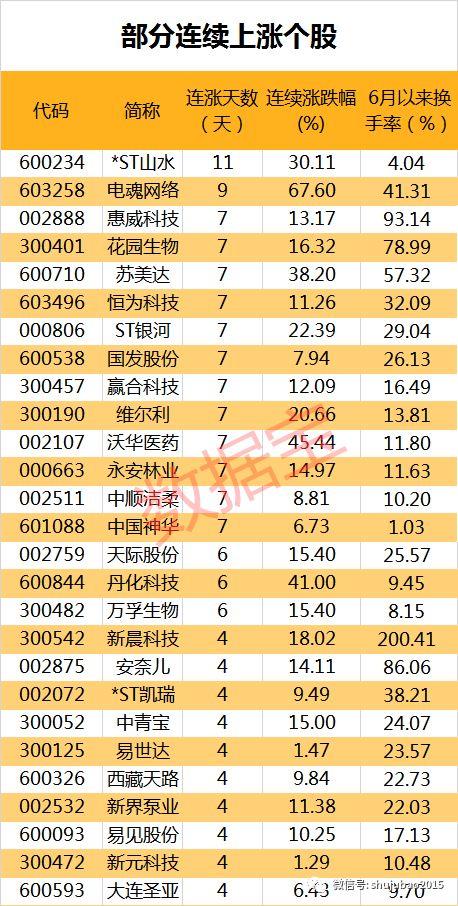 截止最新,沪深两市共有37只个股连涨超4天,表现抢眼。6月以来,沪指围绕2900点来回拉锯,走势平淡无奇。盘整格局下,仍有部分个股走出连涨行情。数据宝统计显