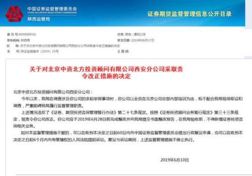 监管政策不断出炉之下,竟有投资咨询公司拒不配合监管调查,而被暂停新增证券投资咨询相关业务。6月17日,陕西证监局网站信息显示,北京中资北方投资顾问有限公司西