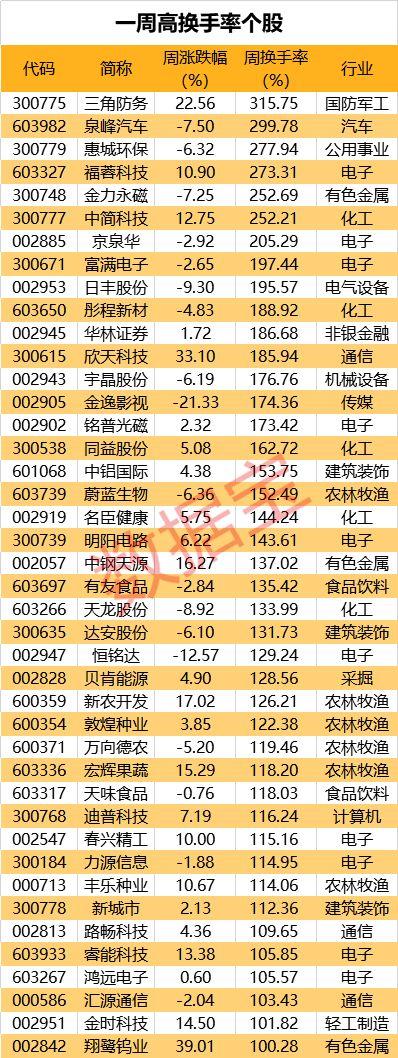 震荡行情下,42股成交活跃,周换手率超过100%,其中铭普光磁(行情002902,诊股)、宇晶股份(行情002943,诊股)、睿能科技(行情603933,诊