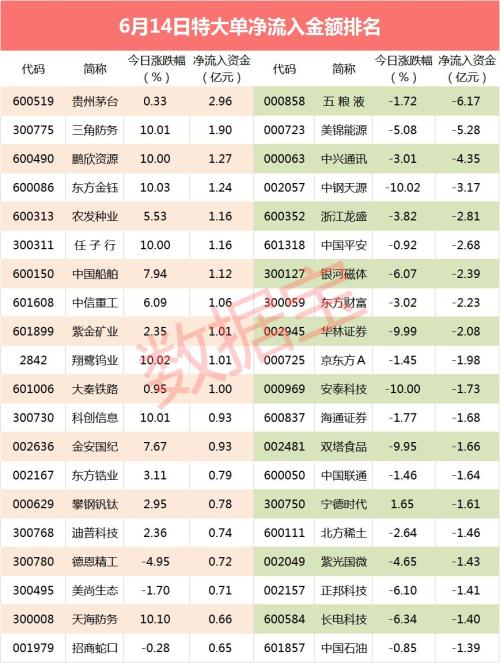 两市全天特大单净流出156.19亿元,共计815股特大单净流入,1837股特大单净流出,贵州茅台(行情600519,诊股)特大单净流入2.96亿元,特大单净