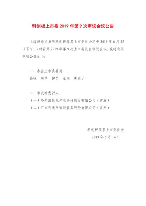 上交所公告,将于6月25日召开2019年第9次上市委员会审议会议,审议发行人哈尔滨新光光电、广东利元亨首发申请。 .klinehk{margin:0 aut