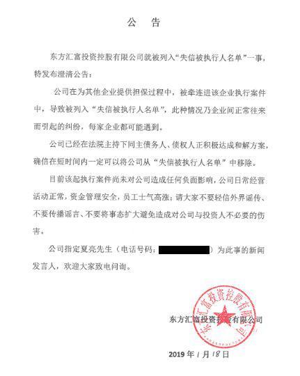 1月18日上午,东方汇富官网发布《澄清公告》,称其是在为其他企业提供担保的过程中被牵连进该企业执行案件,导致被列入“失信被执行人名单”。此种情况是企业间正常往来而引起的纠纷,每家企业都可能遇到。