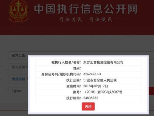 据全国执行信息平台收录的东方汇富投资控股有限公司失信信息,执行法院是宁波市北仑区人民法院,执行案号是(2018)浙0206执3087号,立案时间是2018年9月17日,执行法院是宁波市北仑区人民法院。