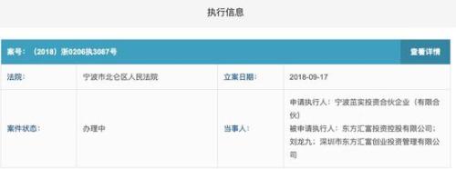 公开信息显示,此次执行的申请人是宁波茁实投资合伙企业(有限合伙),被执行人包括东方汇富投资控股有限公司、刘龙九和深圳市东方汇富创业投资管理有限公司。刘龙九为东方汇富控股的股东,同时也是东方汇富创投董事长、总经理和法定代表人。