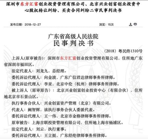 而从2018年11月开始,东方汇富创投还因股权转让纠纷发生多起法律诉讼。相关方涉及上海吉联投资管理有限公司、北京兴业凯富创业投资中心(有限合伙)。兴业凯富的GP为兴业创富资产管理(北京)有限公司。