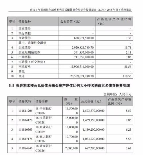 以南方3年战略配售基金债券持仓为例,同业存单(CD)占比不小。正如其四季报所言:投资运作上,南方战略配售的固定收益类投资注重安全性和流动性,配置上以同业存单为主,并配置了一定比例的高等级信用债以提升收益。