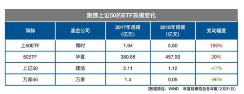 从2018年度规模增幅上看,博时上50ETF(510710. SH)表现最好,此基金年化管理费只有0.3%,近两三年的年化收益率分别是9.5%、26.05%,而同样经历了2018年,万家50缩水96%,目前规模仅剩500万,实实在在跌成了落水狗。