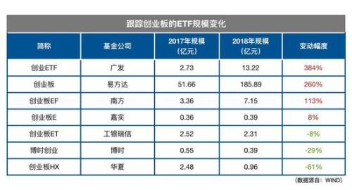 创业板市场在2018年表现最疲弱,跟踪创业板指数的ETF总规模还是增加了147亿元,广发和易方达的创业板ETF规模增幅最大。