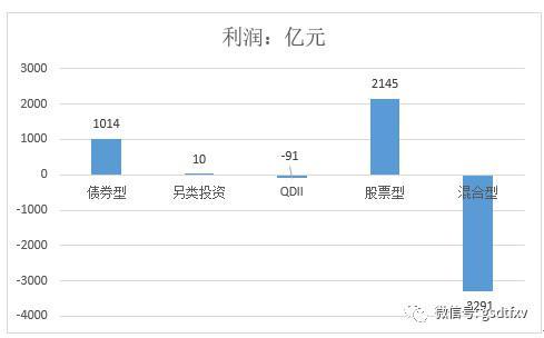 2018年,受海外市场及国内强监管、去杠杆等因素影响,A股市场表现差强人意,股票型基金业绩普遍较差。根据2018年一次基金中报,两次基金季报,估算出基金市场年度利润-1266亿(而2017年公募基金整体盈利超5600亿元),其中非货币基金合计为投资者赚取-4513亿,其中债券型基金赚取最多1014亿,其余QDII基金、股票型基金、混合型基金净利润为负值,分别为-91亿、-2145亿和-3291亿元,混合型基金亏损最多。