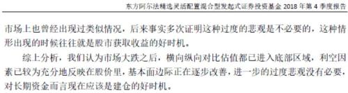 从东方阿尔法基金基金季报看,在2018年3季报里,刘明表示“市场大跌之后,目前时点,横向纵向对比估值都已进入底部区域,利空因素较为充分地反映在股价里,基本面边际正在逐步改善,进一步的过度悲观没有必要,对长期资金而言现在应该是子弹上膛瞄准兔子射击的时候。” 该基金2018年4季报显示,基金仓位已经从三季度末的74.04%,提升到年底的87.13%。