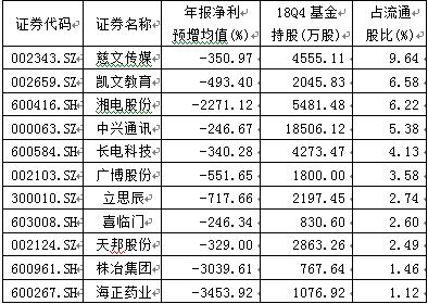而在业绩爆“雷”个股方面,净利预告增长均值下滑100%以上的基金去年四季报持股有49只。其中,基金持股占流通股比逾1%的重仓股有11只(见下表),慈文传媒(002343,诊股)、凯文教育(002659,诊股)、湘电股份(600416,诊股)基金持股以9.64%、6.58%、6.22%的占流通股比居前。