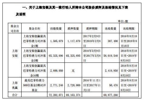 在打官司期间,宝银投资所持有的新华百货的股份被冻结,旗下部分基金也公告投资人暂停赎回。由新华百货提供的公告显示,宝银投资及其一致行动人兆赢投资共计四只基金账户的6088万股被冻结。与此同时,新华百货还强调,除表中所列四只基金账户外,未有上海宝银及上海兆赢旗下其他基金账户持有本公司股份及被冻结情况发生。