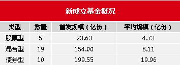 本周,新成立的34只基金中混合型数量最多达19只,其次是债券型10只;债券型规模最大达199.55亿份,其次是混合型154.00亿份;无货币型和QDII型成立