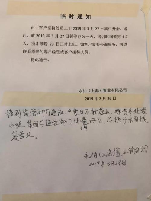 贴在左边的通知,以手写的字迹表明:“接到监管部门通知,暂且不能营业。待资产处理小组、集团与监管部门协调好后,尽快于本周恢复营业。”落款时间为3月29日,落款方为永柏(上海)置业有限公司(下称“永柏置业”)。永柏置业由永柏资本实际控制,也是31亿元未兑付地产私募股权基金对应的融资主体,两家公司为同一办公地点。
