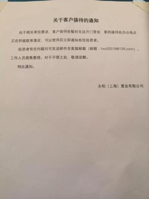 贴在右边的通知则告知投资者,由于相关单位要求,客户接待处暂时无法开门营业,新的接待处办公地点正在积极联系落实。此外,永柏置业留给投资者的联系方式,只有一个客服邮箱。
