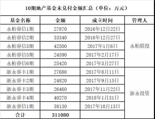 其中,包含永柏联投和浙永投资发行的3只地产类私募股权基金——永柏睿信私募股权投资基金(下称“永柏睿信”)、浙永睿丰私募股权投资基金 (下称“浙永睿丰”)、浙永睿信私募股权投资基金(下称“浙永睿信”)。