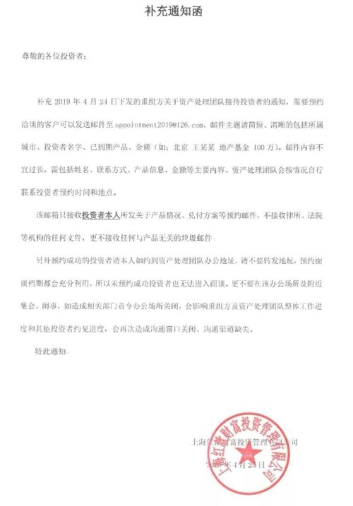 次日,红歆财富又发来一份补充通知函称,资产处理团队会按情况自行联系投资者预约时间和地点。并强调,该邮箱只接受投资者本人所发关于产品情况、兑付方案等预约邮件,不接收律所、法院等机构的任何文件,更不接收与产品无关的垃圾邮件。