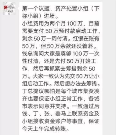 据红歆财富内部员工提供的微信聊天记录,在4月10日召开的上海会议中,红歆财富还在为资产处置小组“两个月100万”的费用发愁。其中提到,红银(红歆财富品牌名)账上只有50万元,另外50万元需要想办法筹措。