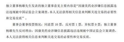 不过,就在今年1月30日,康美药业发布了一则《关于转让参股公司股权的公告》,宣布公司已经与广发证券签订股权转让协议,拟将所持有的广发基金9.458%股权全部予以转让,转让价款暂定为13.9亿元。同日,广发证券也发布公告宣布受让康美药业持有广发基金9.458%的股权,其中独立董事杨雄提出了反对,其理由是“因康美药业涉嫌信息披露违法违规被中国证监会立案调查,本人无法获得相关信息来判断关连交易的必要性和交易实质”。